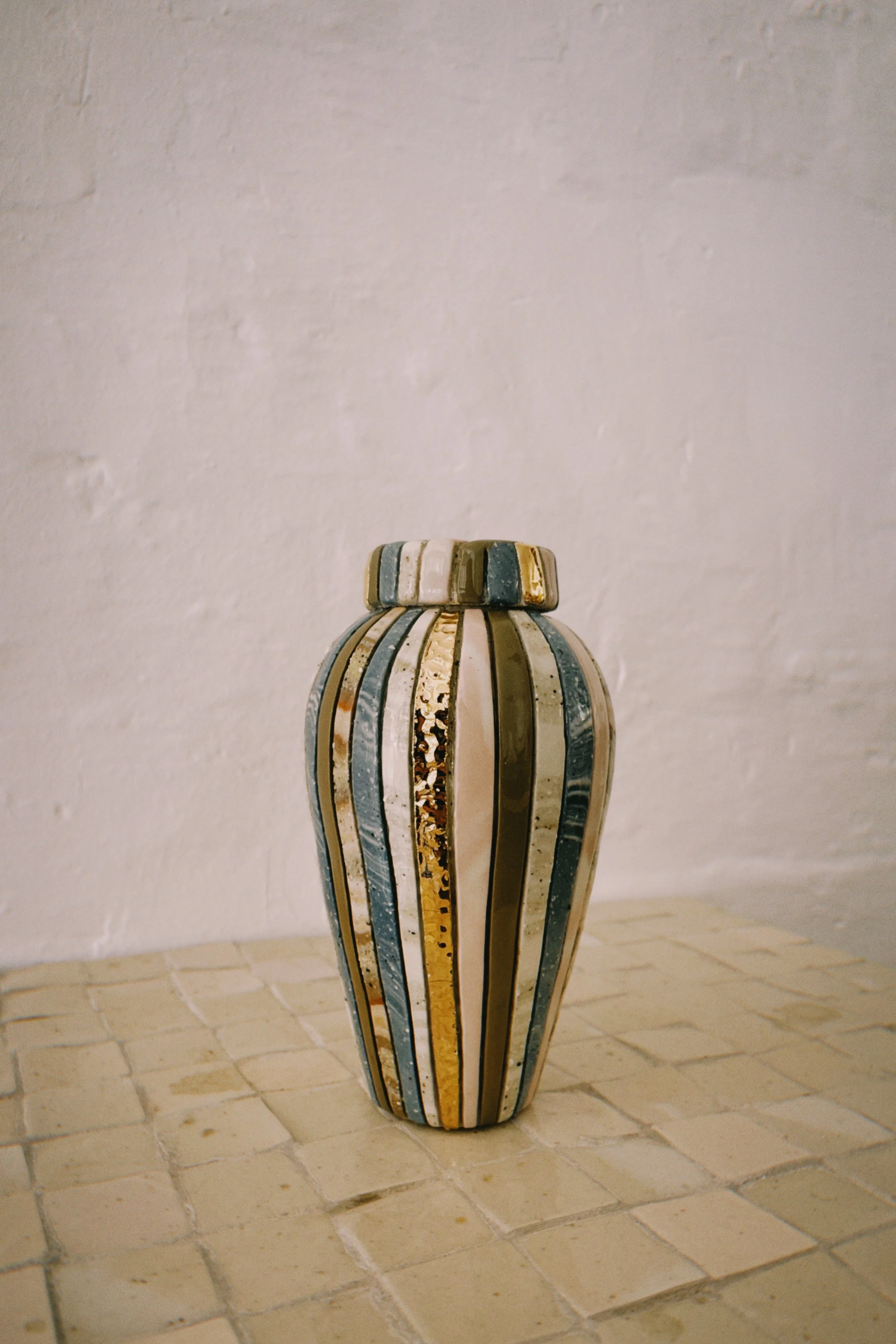 The technical aspects of the Marmoreal collection showcase Mustika's approach to clay manipulation. Her marbled clay technique develops complexity through grid-like expressions, checkered patterning, and striped arrangements that flow across undulating forms, creating what she describes as "a deliberate tension between strict patterning and organic movement." Three significant works define this period: the Striated Vase, which established a new direction in surface treatment; the Marmoreal Checkered works, demonstrating pattern play; and the Block Marbled Vases, which reveal the subtleties of single-colour marbling. Each piece presents material contrasts – glossy marbled surfaces against matte clay, enhanced by considered gold accents.